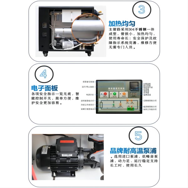 1.傳熱泵浦:采用臺灣元新系列高溫泵浦,運行快準,傳熱效果明顯,噪音低,無滲漏.
